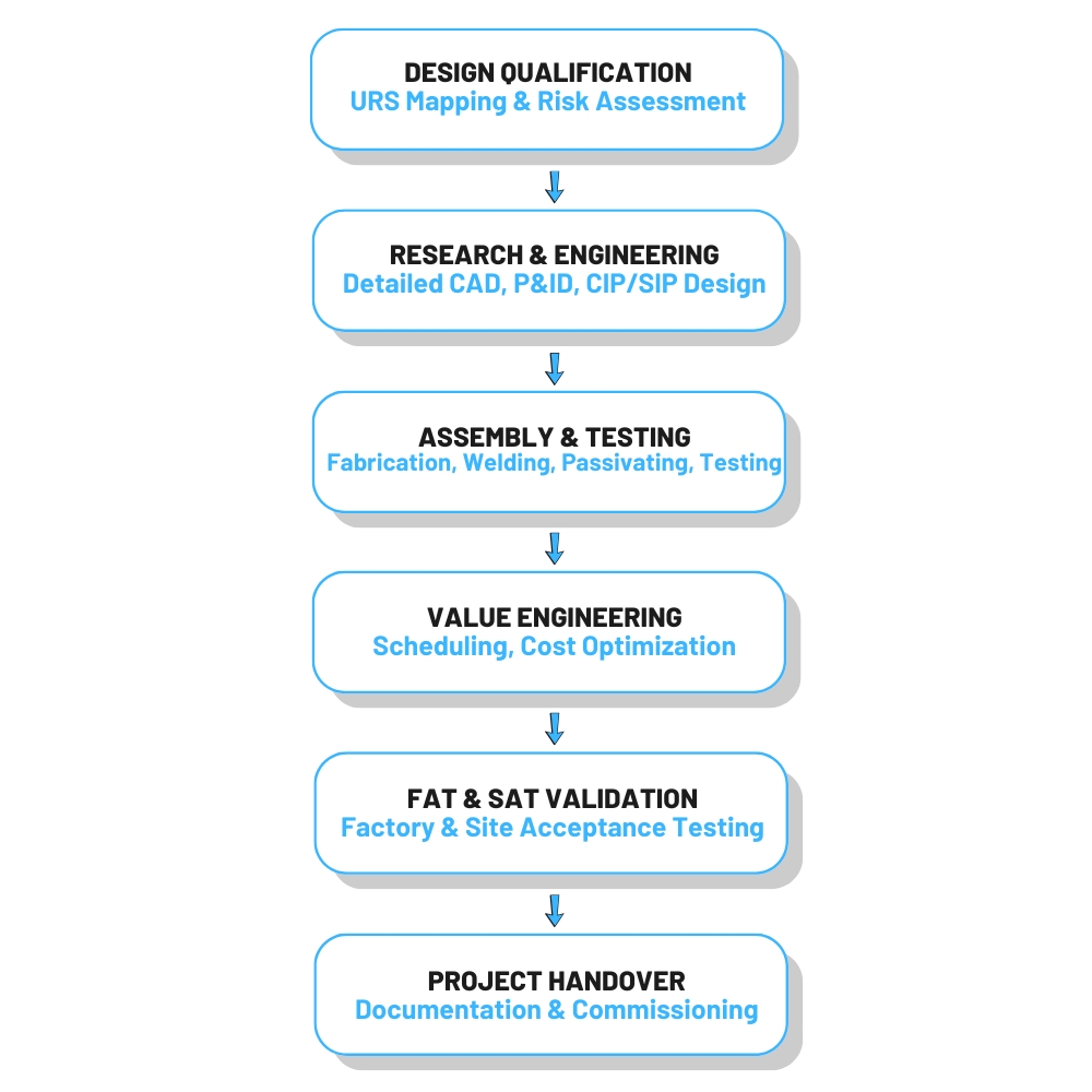 Systems designed as per US FDA, cGMP & ASME norms.