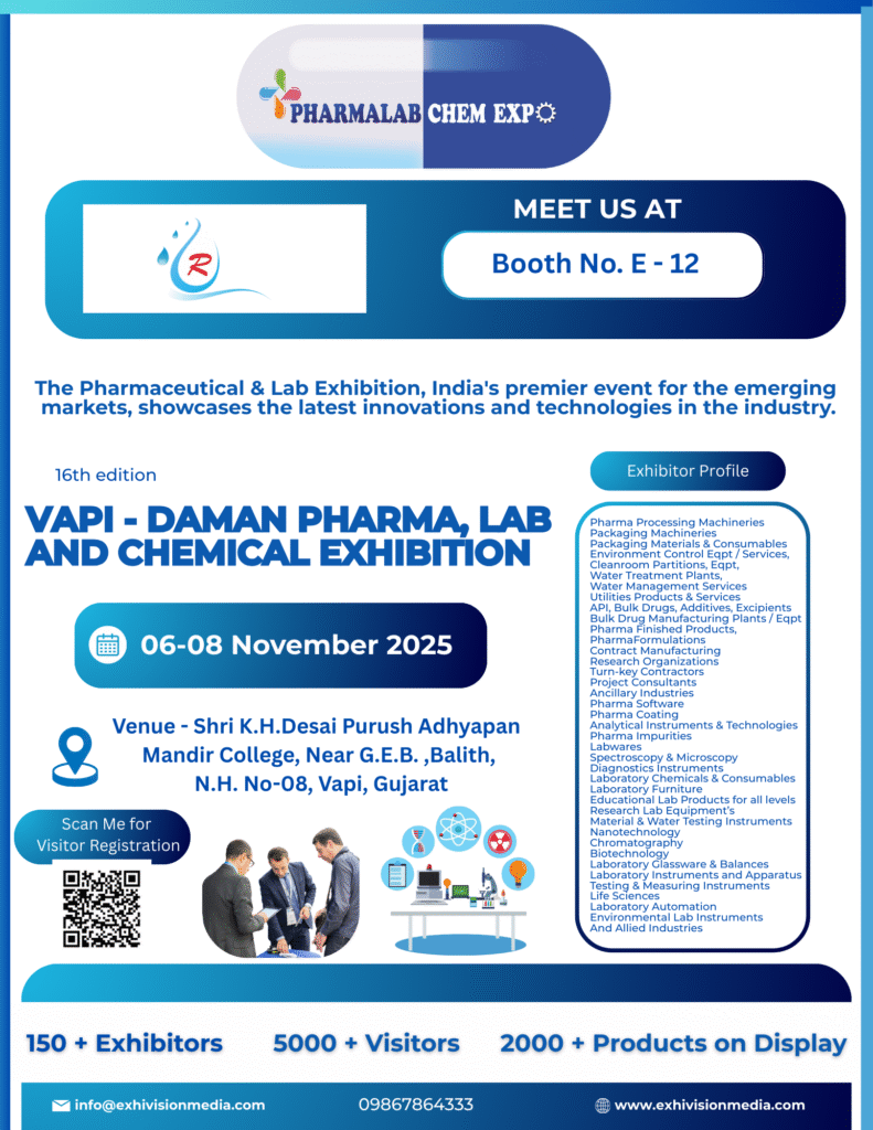 We are excited to announce that Ruby High Purity Water Systems will be participating in the 16th Edition of Vapi β Daman Pharma, Lab and Chemical Exhibition. This premier Pharmaceutical & Lab Exhibition is Indiaβs leading platform showcasing the latest innovations, technologies, and solutions for the emerging markets.